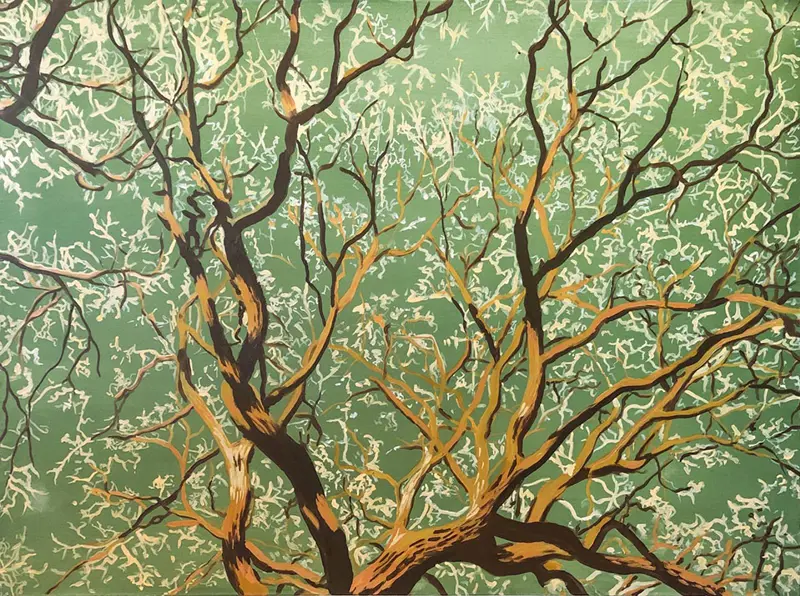I make mixed-media paintings inspired by landscapes encountered through travel. My happy place is in front of my easel.