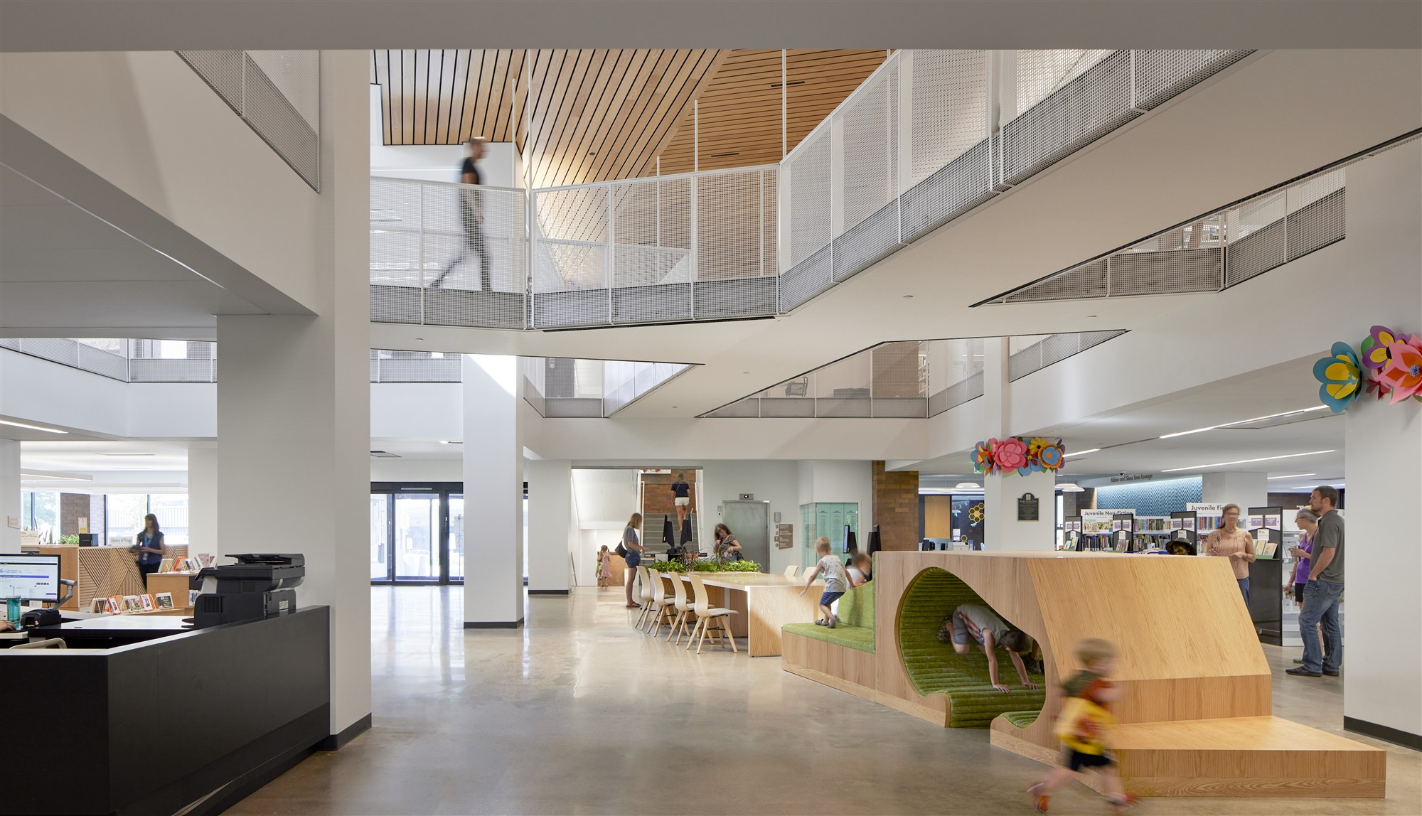A 1970s library located in downtown Eau Claire, Wisconsin, L.E. Phillips Memorial Public Library had a tight column grid, low floor-to-floor heights, few windows, and limited room for growth. The transformation features new windows that showcase activity happening inside the library and skylights that bring daylight deep into the center of the building. The roof level addition features large spaces for community events and a terrace with expansive views. A new public plaza improves the connection between the library and downtown.