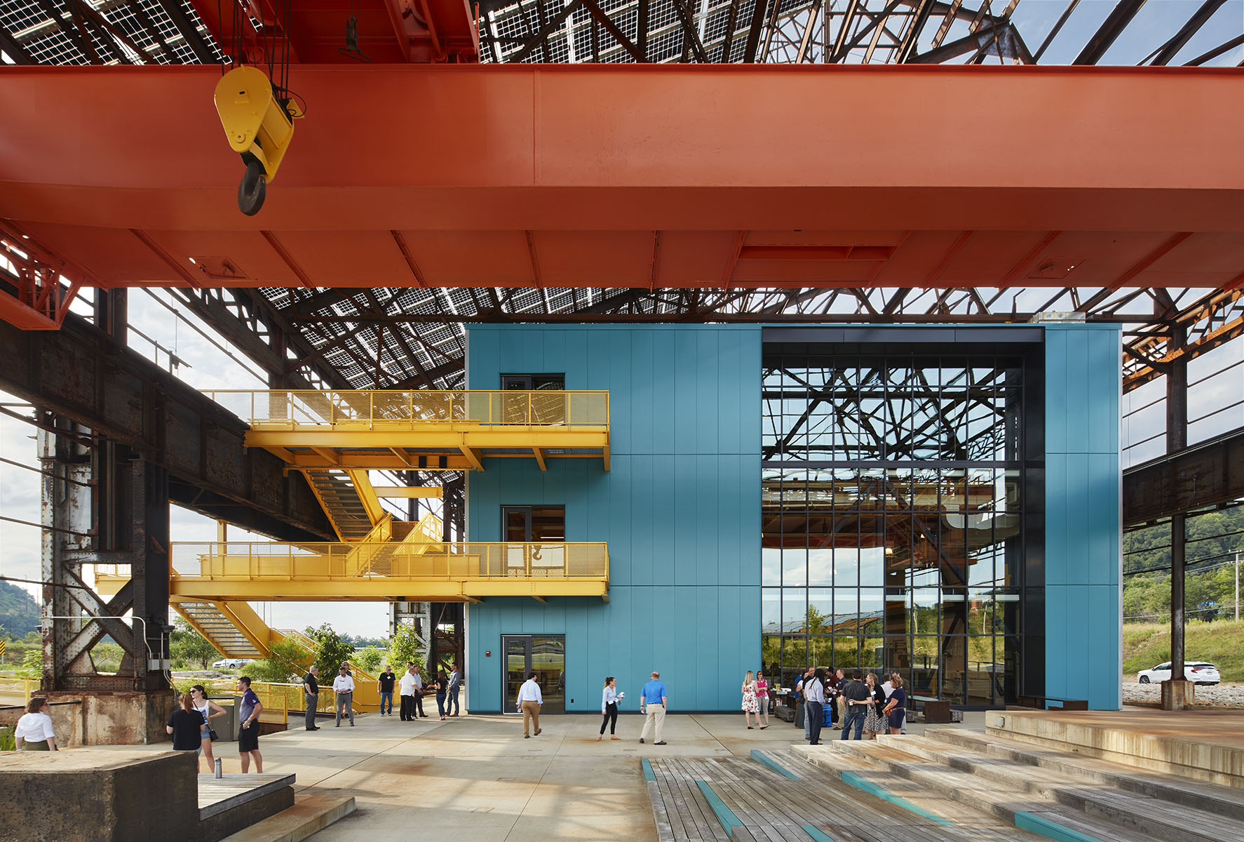 Winner of a national AIA COTE Top Ten Award and a Metropolis Planet Positive Best Adaptive Reuse Innovation Award, Mill 19 involved repurposing the steel skeleton of an abandoned steel rolling mill as an outer shell for new high-tech office, lab, and advanced manufacturing facilities. Tenants and visitors navigate this atmospheric mix of new and old via a network of new plazas, elevated walkways, balconies, and gardens. The project also features the largest single-sloped glass solar array in the U.S.