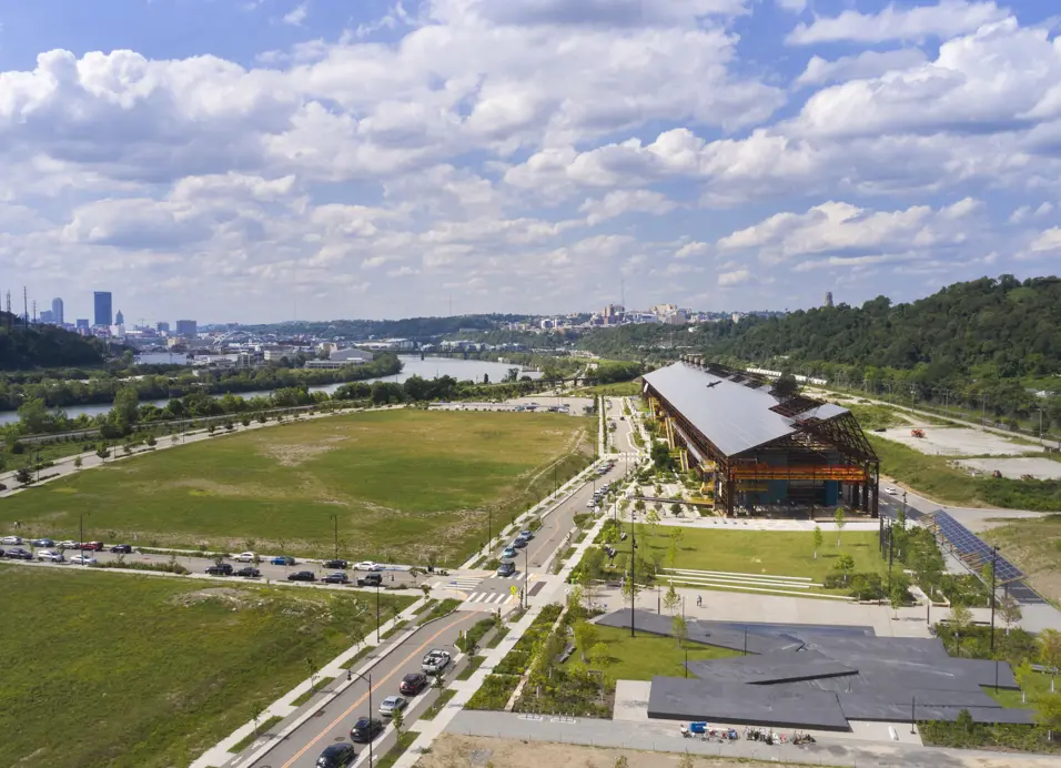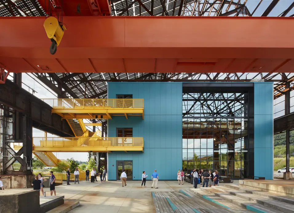 Designed by MSR Design, Mill 19 is a living emblem of Pittsburgh’s transformation from its industrial steel-making past to a future of sustainable advanced manufacturing. In a bold approach to adaptive reuse, the design viscerally interweaves new space for the city’s robotics industry within the industrial ruins of a decommissioned steel rolling mill. A post-industrial promenade welcomes the public through a linked series of compelling exterior experiences framed between the monumental 1,360 foot-long existing steel superstructure and three multi-tenant tech buildings sited within. Key design moves include peeling away the existing mill’s deteriorated sheet metal skin; exposing its dramatic steel skeleton; and installing a sequence of speculative high-tech office, lab, and manufacturing structures within the ruinous frames.