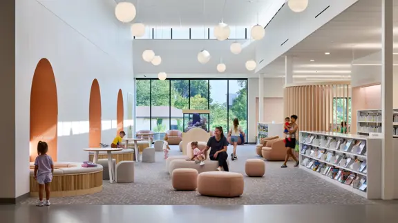 This expansion to a beloved community library offers more amenities and unique opportunities to learn, connect, gather, and participate in enriched programming. The expansion reflects the community library’s values, including reading and education (focusing on all forms of learning for all ages, backgrounds, and abilities), arts and culture, bicycling and trails, connections to nature, collaboration, human services, and equitable access. New features include an expanded children’s area with storytime space and craft area; a centrally-located, flexible makerspace; an expanded teens’ zone; additional meeting rooms; and an expanded Friends bookstore.