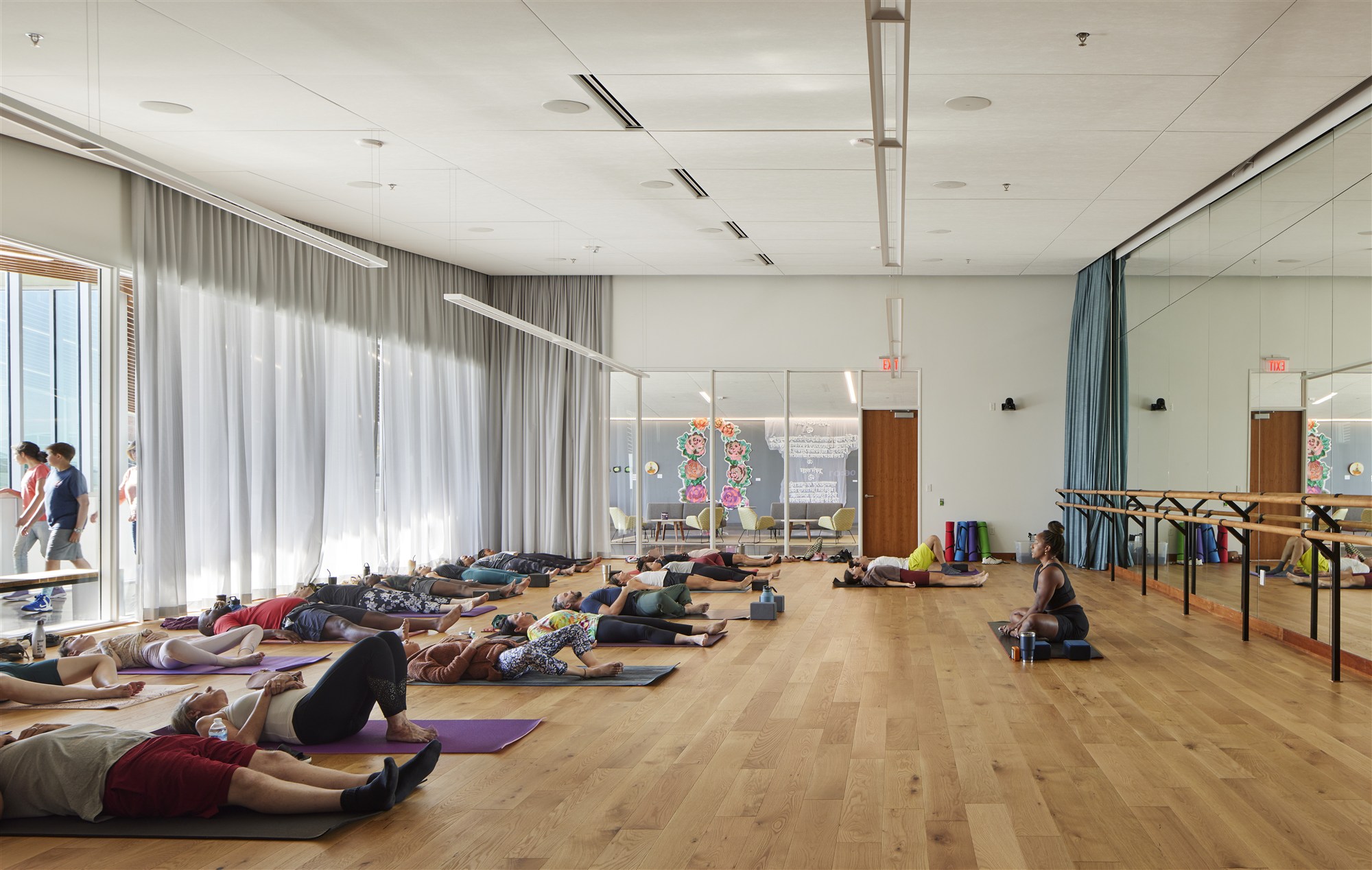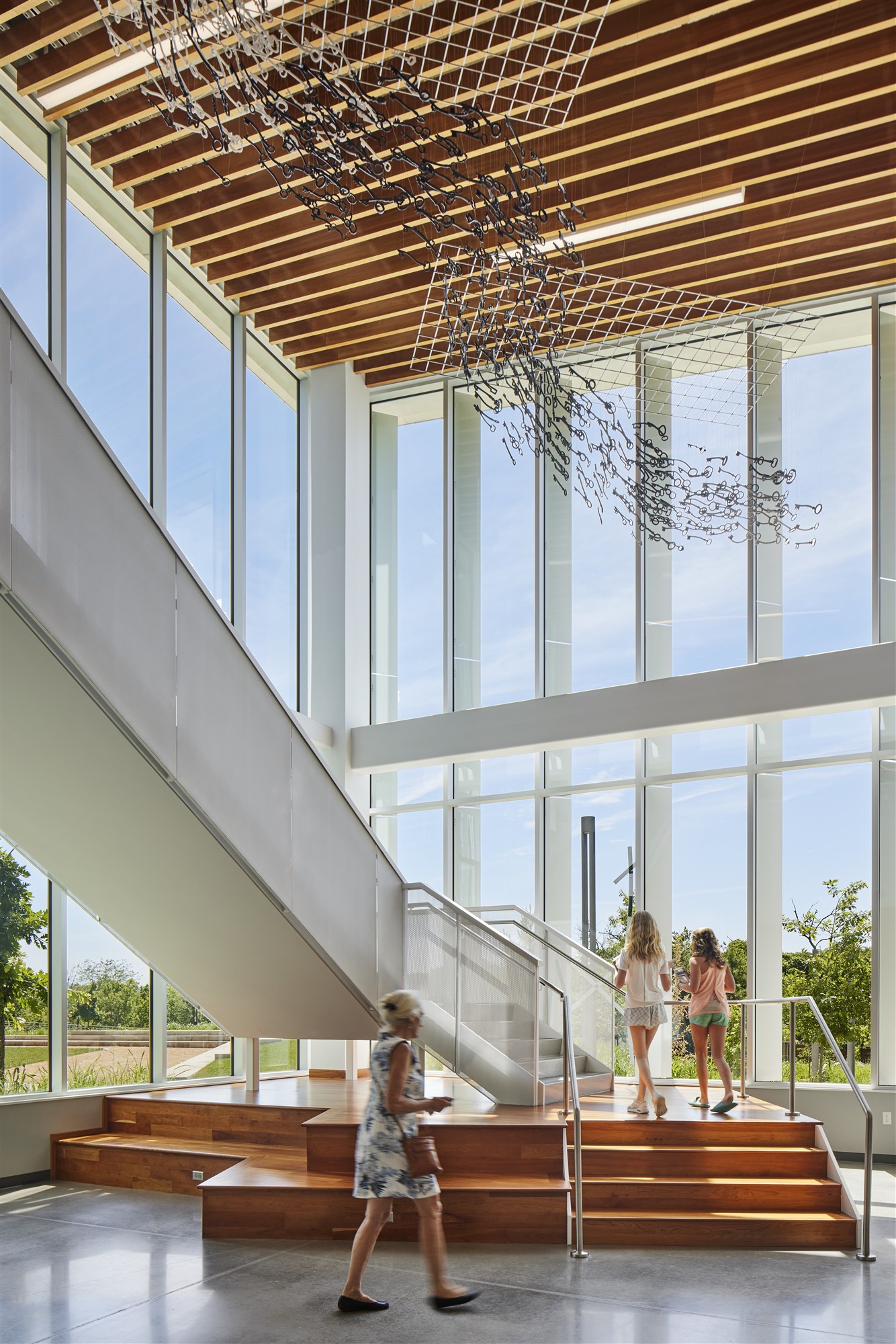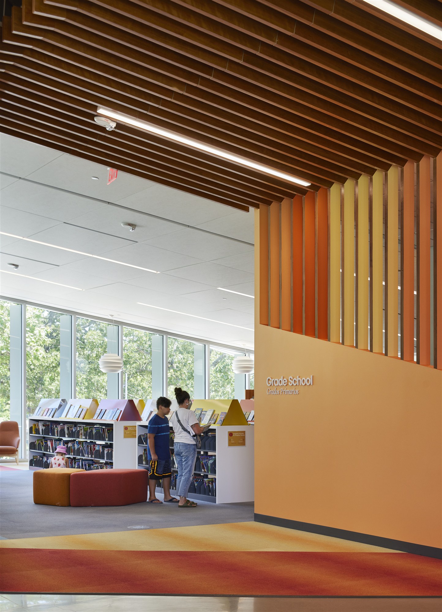 The addition includes a 700-seat, flexible event center that serves as a full-function auditorium; additional meeting and group study spaces; greatly expanded youth services; an innovation center with audio recording studio, video recording studio, editing suites, virtual reality studio, photography studio, a simulation lab, and a fabrication and robotics lab; an art and movement room; an expanded children’s library; a private teens-only lounge and gaming center; a green roof; a commercial teaching kitchen for cooking classes and food production; and a deli that serves the community.