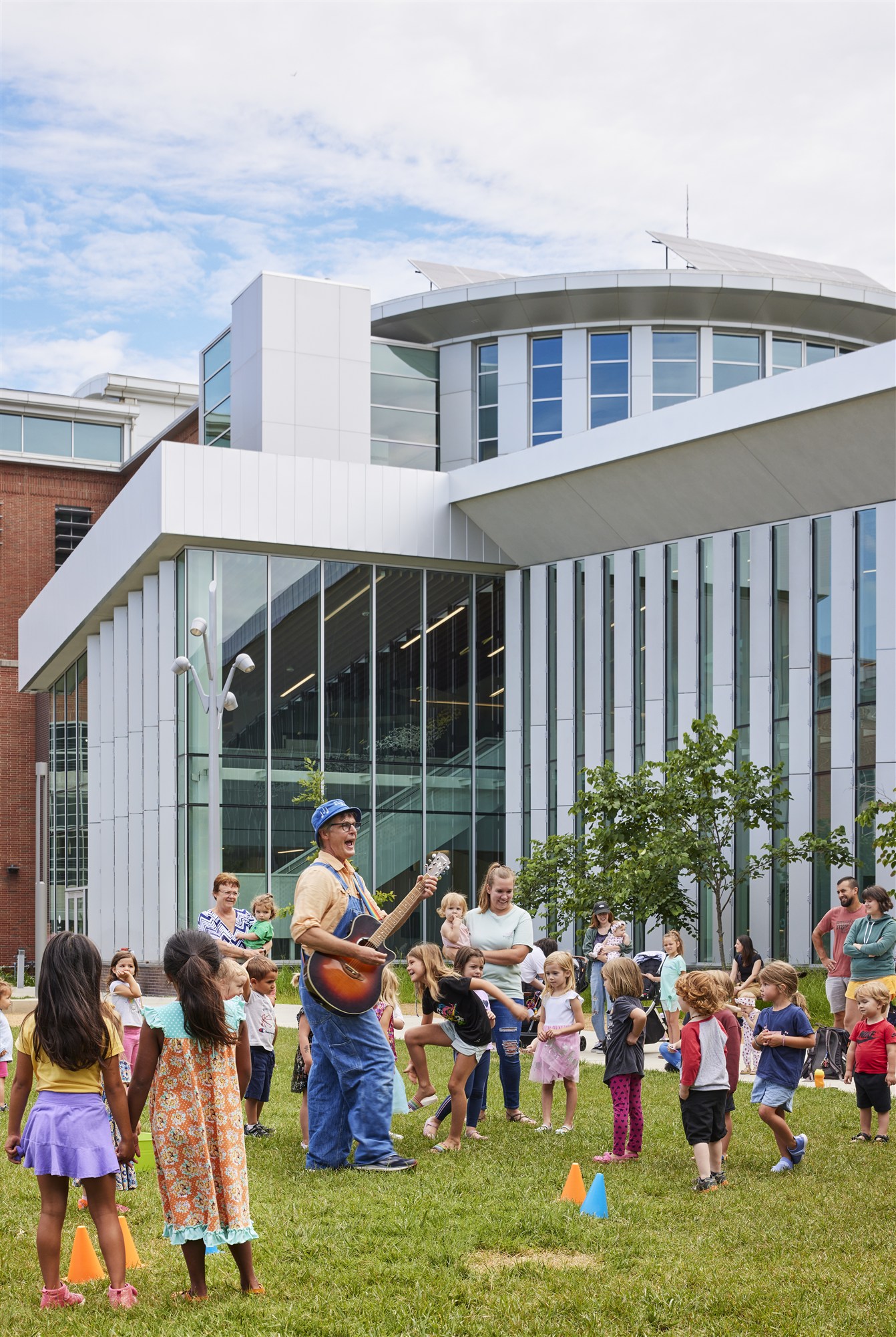 This expansion to a community library, originally designed by MSR Design, redefines the traditional public library model, providing enhanced educational opportunities, services, and innovative programming for all ages. The expansion follows the sloping topography sited below the existing building to create a three-sided courtyard with local plantings that serves as a new public gathering space.