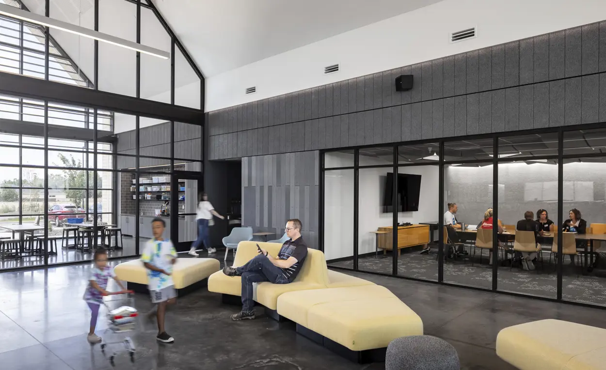 This new community library is designed to create connections in the community with a focus on removing barriers to access and expanding all-inclusive services and programs. In response to a public input process and focus group sessions with parents and local educators, the design team developed a design that supports the needs of neurodivergent community members, going beyond merely providing a dedicated sensory space to creating a holistic library experience approach focused on sound, durability, lighting, extension of tactile surfaces, and ease of building use. The library serves as a family-oriented gathering and learning center designed to inspire creativity and a sense of purpose.