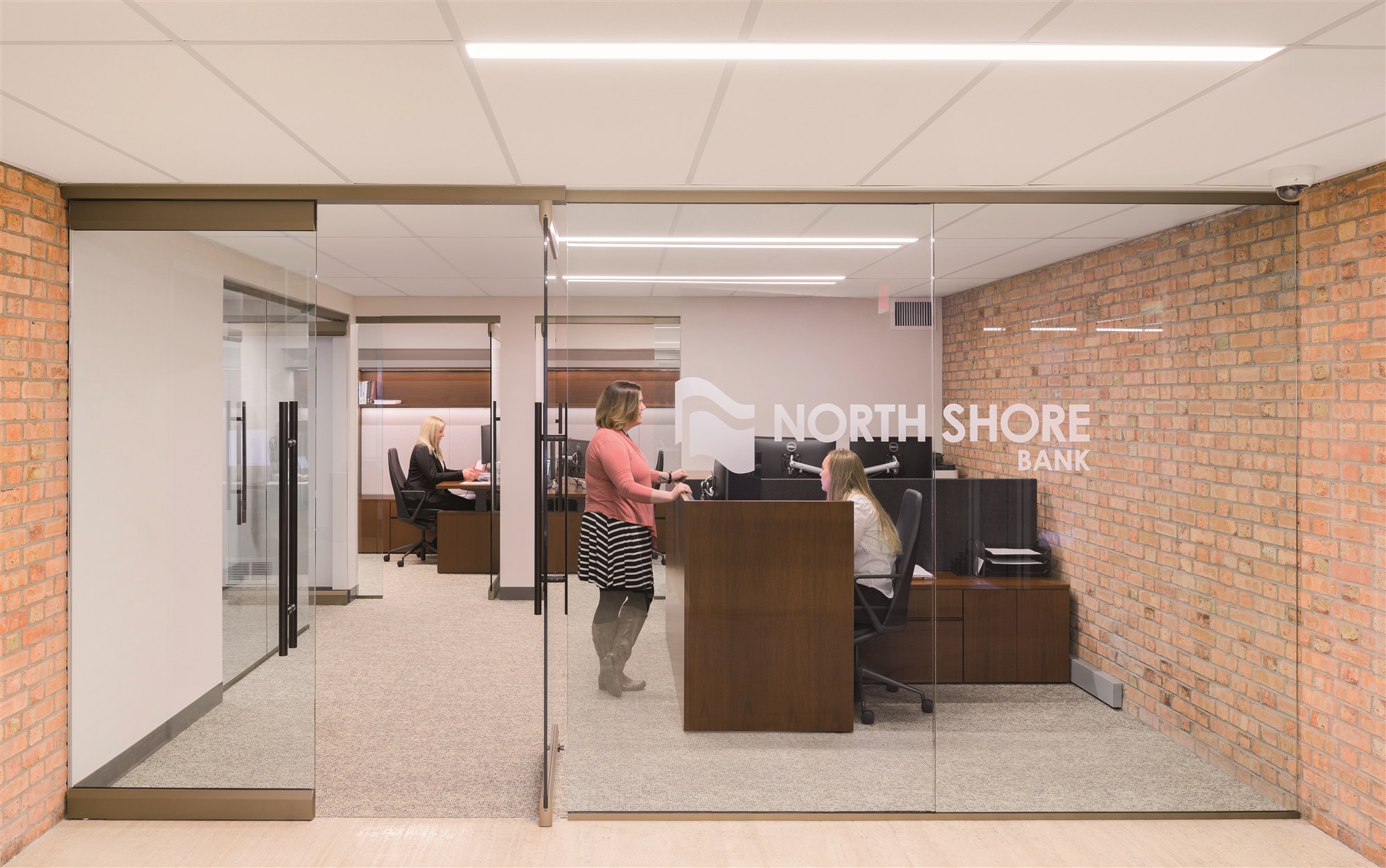 The renovation offers a welcoming, customer-focused atmosphere that simultaneously represents the independent, locally-owned bank’s history and position within the Duluth community and supports its forward-thinking approach to banking. The design preserves elements of the building’s mid-century architecture considered sacred, including original wood veneer panels, the vault, terrazzo stairs, a metal wall-mounted clock, wood ceiling beams, travertine flooring, and textured brick walls. The overall layout clusters private offices and closed conference rooms in the center with open public spaces, such as the lobby concierge desk, gallery, entry lounge, social pantry, and writing nook, located along the perimeter. The removal of a large, low soffit that housed a non-operating HVAC system creates a grander experience upon entering the building from Superior Street and draws daylight into the interior.