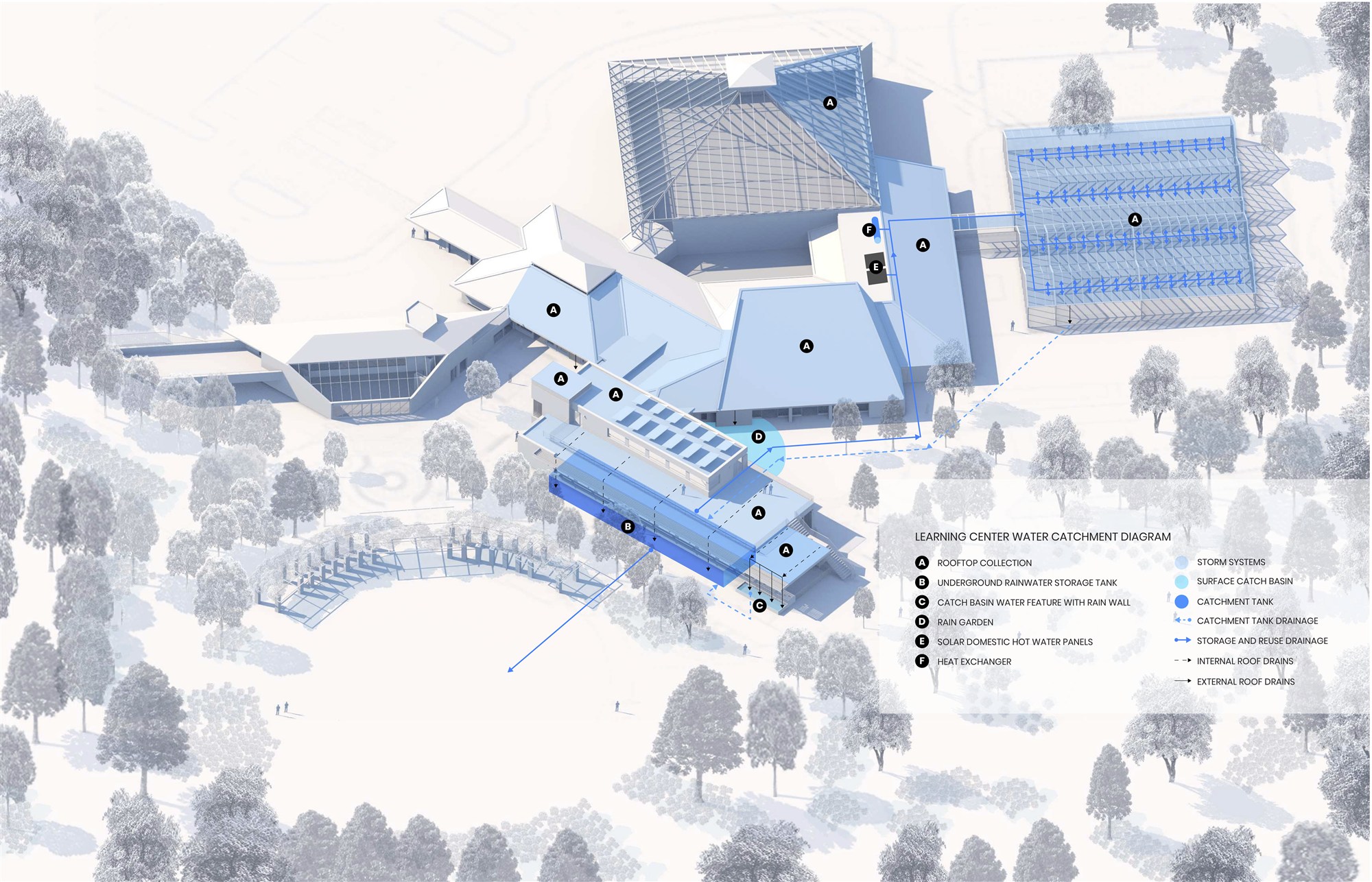 The design features a 60,000-gallon underground cistern beneath the learning center that captures rainwater to provide 75% of the water needed for the greenhouse, eliminating the need for a stormwater retention pond on site. The new, highly-efficient smart greenhouse features a hydronic radiant heating system, misting system for localized cooling, automated roof vents, and BAS control. Certified LEED-NC v.3 Platinum and designed to use 61% less energy than the baseline, the learning center features a hydronic radiant floor system and a PV solar array on the roof.