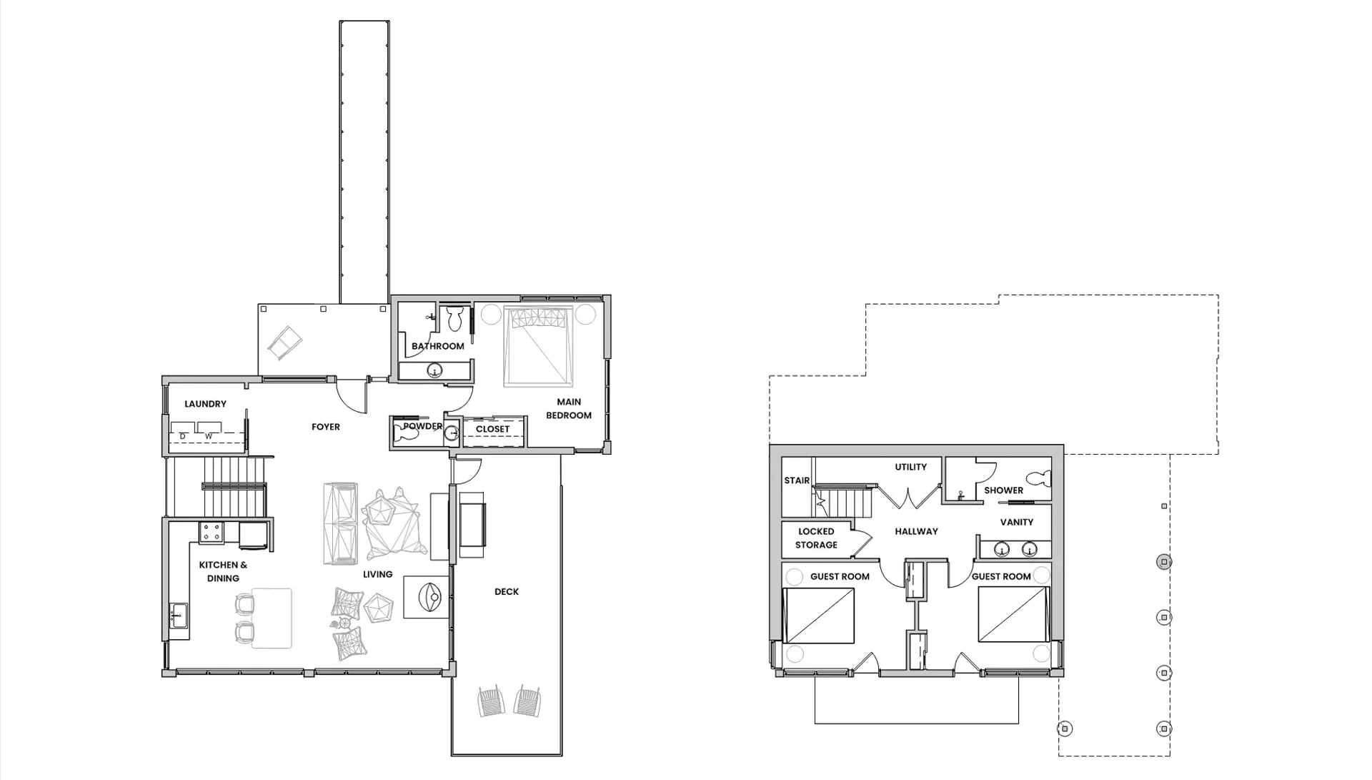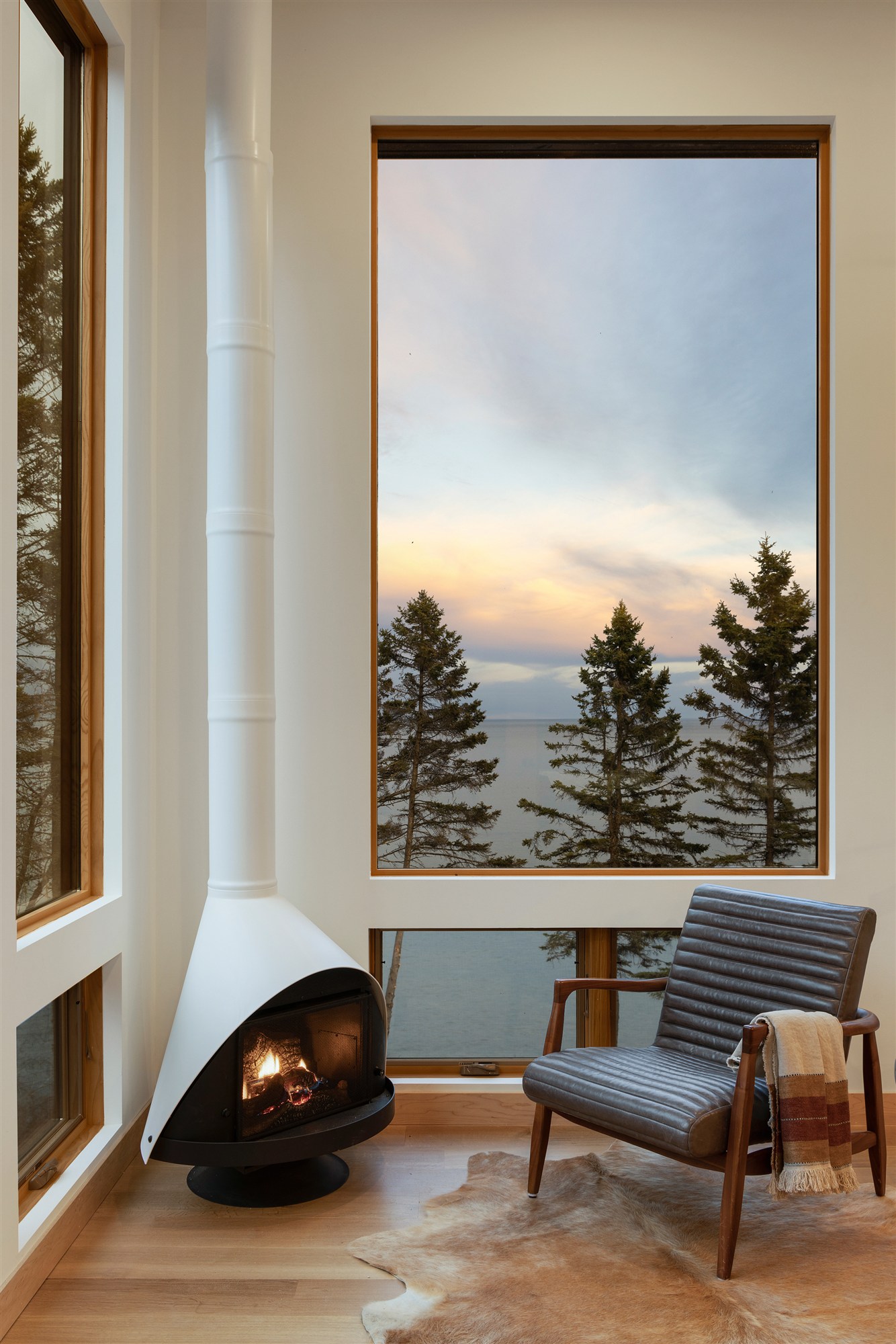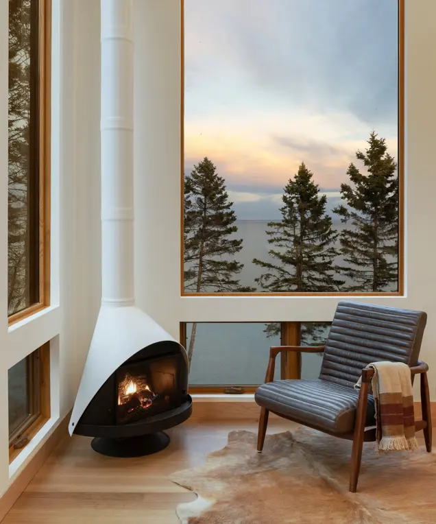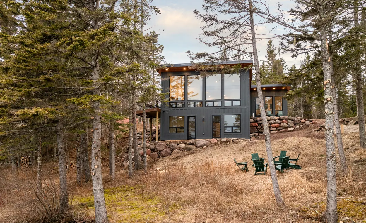 Tallens Stuga, or "Cabin of the Pine Trees" in Swedish, is a modern rental cabin on Lake Superior. This new cabin's structure is pushed up to the set-back from the lake on a steeply sloped site to take full advantage of the proximity to the water. Design features include a simple sloped roof with a side deck that extends past the front of the cabin to offer a 270-degree view of the lake. As many existing trees as possible have been retained by positioning the cabin between them. The client also plans to add a sauna in the future.